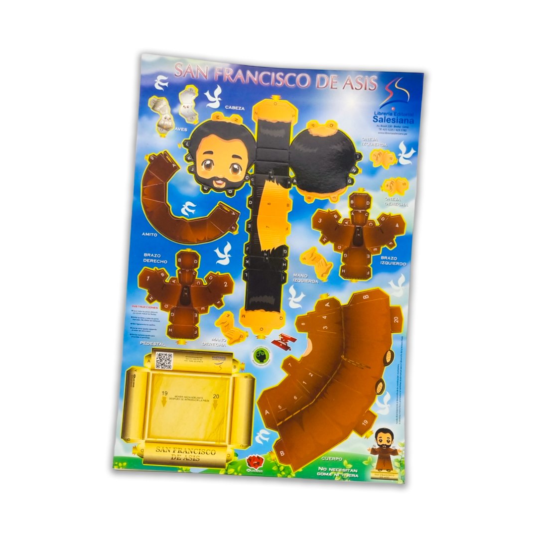 Figura armable de San Francisco de Asís. ¡Para divertirse en familia y que los chicos aprendan! este armable ayuda al desarrollo de la coordinación visomotora, la destreza motriz fina y promueve la habilidad óculomanual para el desarrollo de la lectoescritura.