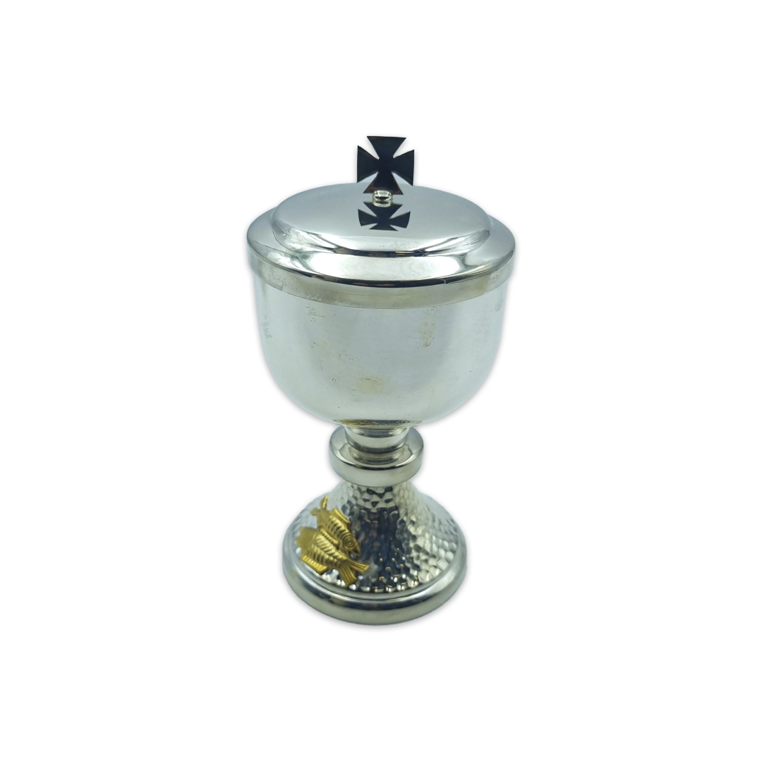Presentamos nuestro Copón Pequeño con Aplicación Base, una pieza delicadamente elaborada para complementar cualquier ceremonia litúrgica. Este copón, con su diseño elegante y funcional, es perfecto para pequeñas congregaciones o para momentos de adoración más íntimos.