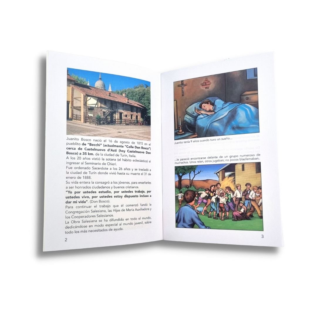 Este libro ilustrado, dirigido a los pequeños –y no tan pequeños-, contiene diferentes episodios de la vida de San Juan Bosco, durante su niñez.