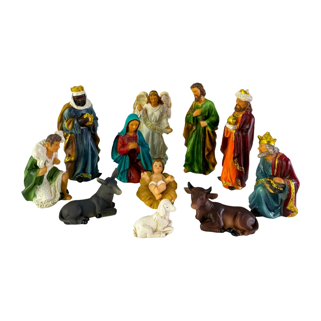Este encantador nacimiento de 11 piezas, con medidas de 7 x 5.5 x 12.5 cm, incluye la Sagrada Familia, los Reyes Magos, un ángel y animales, todos diseñados con detalles finos y colores vibrantes. Es perfecto para decorar cualquier espacio de tu hogar y celebrar el verdadero significado de la Navidad.