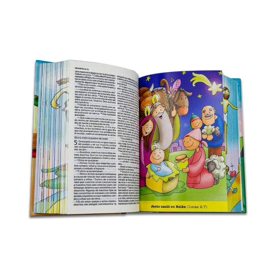 • Encartes con 60 ilustraciones a todo color que constituyen un recorrido por la historia de la Salvación que permite a los más pequeños familiarizarse con una visión continuada y coherente de los libros de la Biblia.