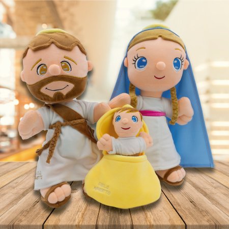 Peluche Sagrada Familia, antialérgico, relleno de napa siliconada, con detalles de tela y/o peluche.