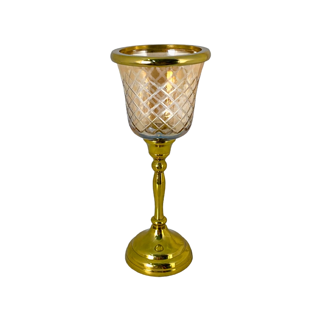 Este portavela, con una altura de 28 cm, destaca por su diseño clásico y acabados dorados combinados con vidrio decorativo. Ideal para iluminar y decorar cualquier rincón de tu hogar u oficina, aporta calidez y estilo a mesas, estantes o eventos especiales.