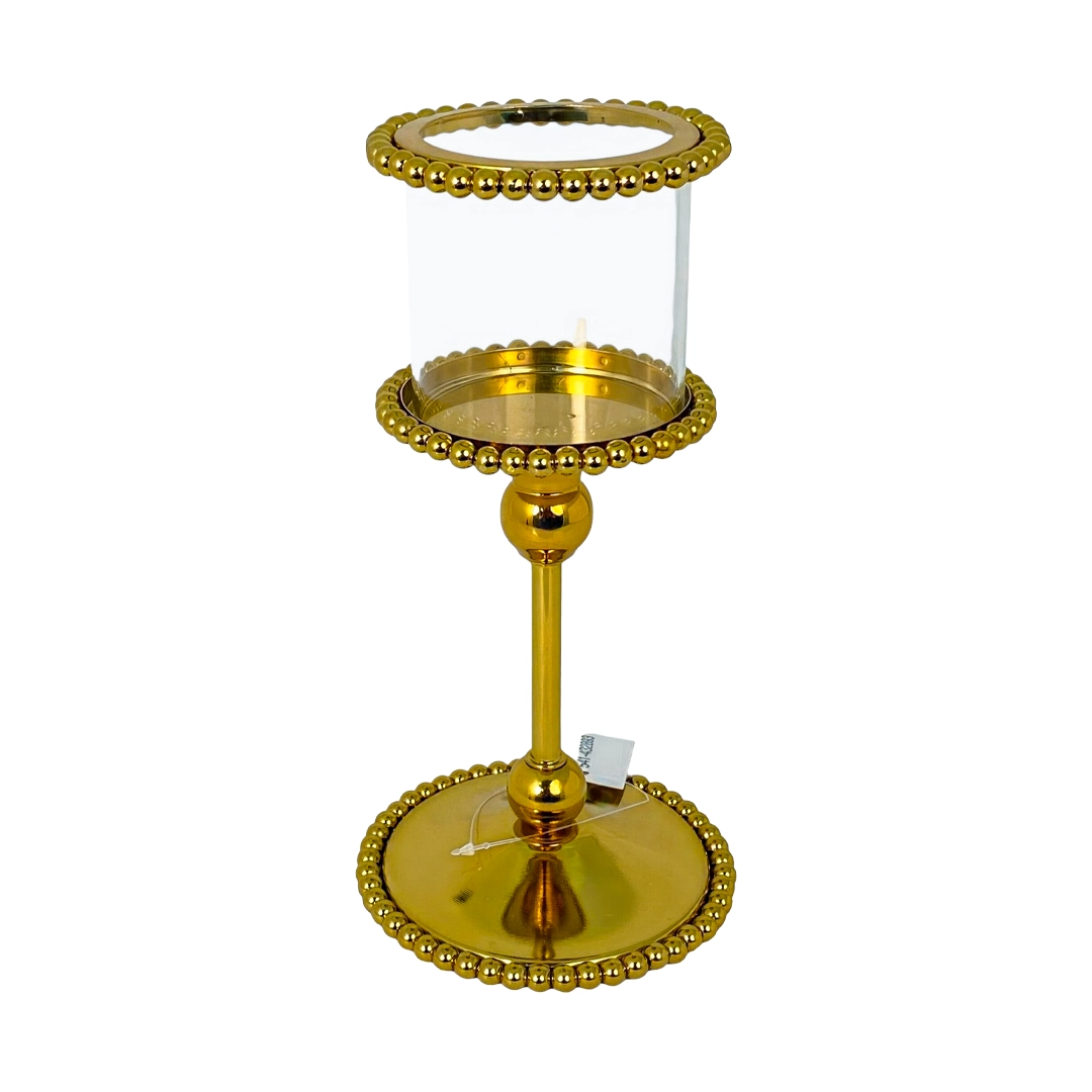 Este portavela de 24 cm de altura destaca por su diseño dorado con detalles decorativos en el marco, ideal para aportar calidez y sofisticación a cualquier ambiente. Perfecto para mesas, estanterías o como pieza central, es el complemento ideal para iluminar con velas decorativas.