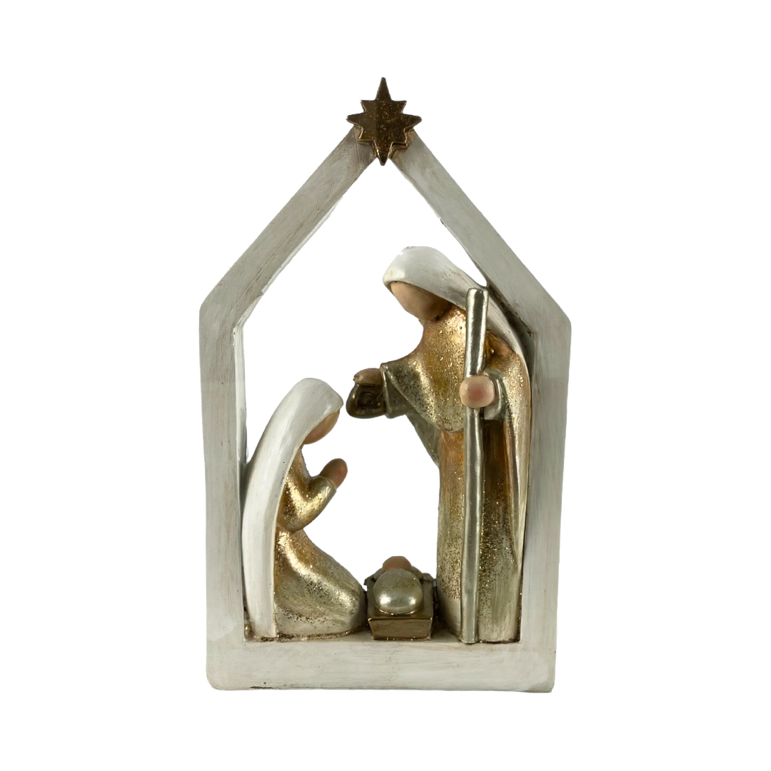 Esta hermosa representación de la Sagrada Familia está elaborada con un diseño moderno y minimalista que combina tonos blancos y dorados. El marco, que simula un pesebre, enmarca la escena con elegancia y sencillez.